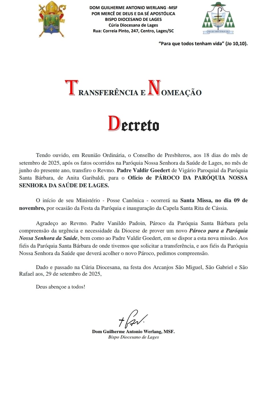 O Bispo Diocesano de Lages, Dom Guilherme, publicou decreto nomeando o Padre Valdir Goedert como novo pároco da Paróquia Nossa Senhora da Saúde, no bairro Guarujá, em Lages. O decreto oficial confirma a missão confiada ao sacerdote de conduzir pastoralmente a comunidade paroquial.