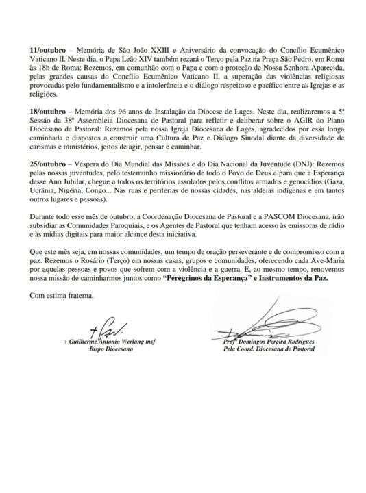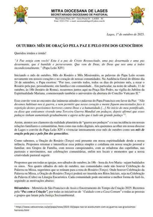 Atendendo ao apelo do Papa Leão XIV, a Diocese de Lages convida todos os fiéis a viverem o mês de outubro como um tempo forte de oração pela paz e pelo fim dos genocídios no mundo. Unidos ao Papa, queremos responder ao seu pedido para que rezemos diariamente o Rosário – pessoalmente, em família e em comunidade.