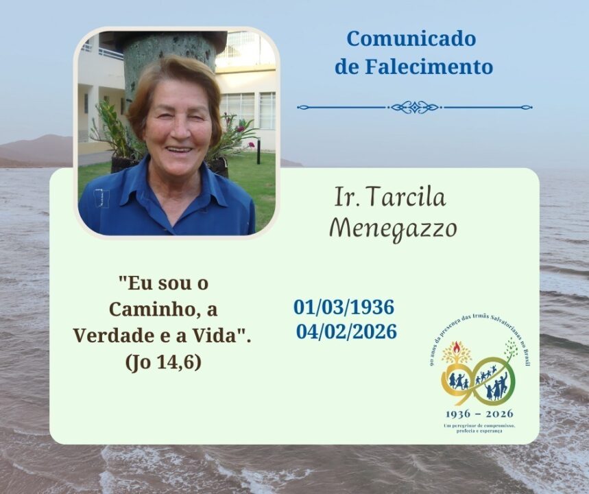 A Diocese de Lages se une em oração e gratidão pelo falecimento da Ir. Maria Tarcila Menegazzo, Irmã Salvatoriana, ocorrido no dia 4 de fevereiro, recordando com fé sua vida inteiramente dedicada a Deus, à Igreja e à catequese. Aos 89 anos, Ir. Tarcila vivia em Videira, sob os cuidados da comunidade das Irmãs Salvatorianas, que a acompanhava com carinho e gratidão.