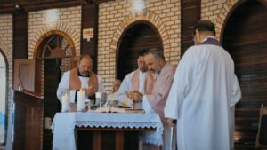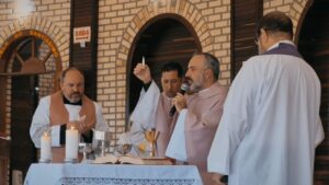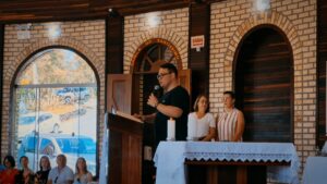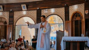 Durante a procissão das oferendas, foi apresentado o tradicional Eierkranz, pão doce alemão cujo nome significa “coroa de ovos”. O gesto recordou uma graça alcançada por uma família, que recebeu de volta seu pai após a Segunda Guerra Mundial, emocionando a assembleia e destacando a força da fé transmitida entre gerações.