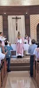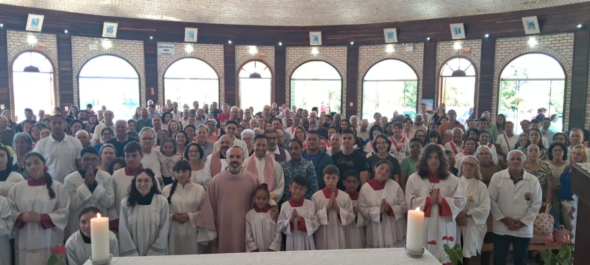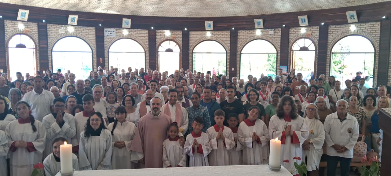 Às 10h30, foi celebrada a Santa Missa do Quarto Domingo da Quaresma, reunindo fiéis de diversas localidades. Um momento marcante da celebração foi a entrada da imagem de Nossa Senhora Aparecida, conduzida por um casal de São Joaquim, acompanhado por famílias de Bom Retiro, Urubici e Lages.